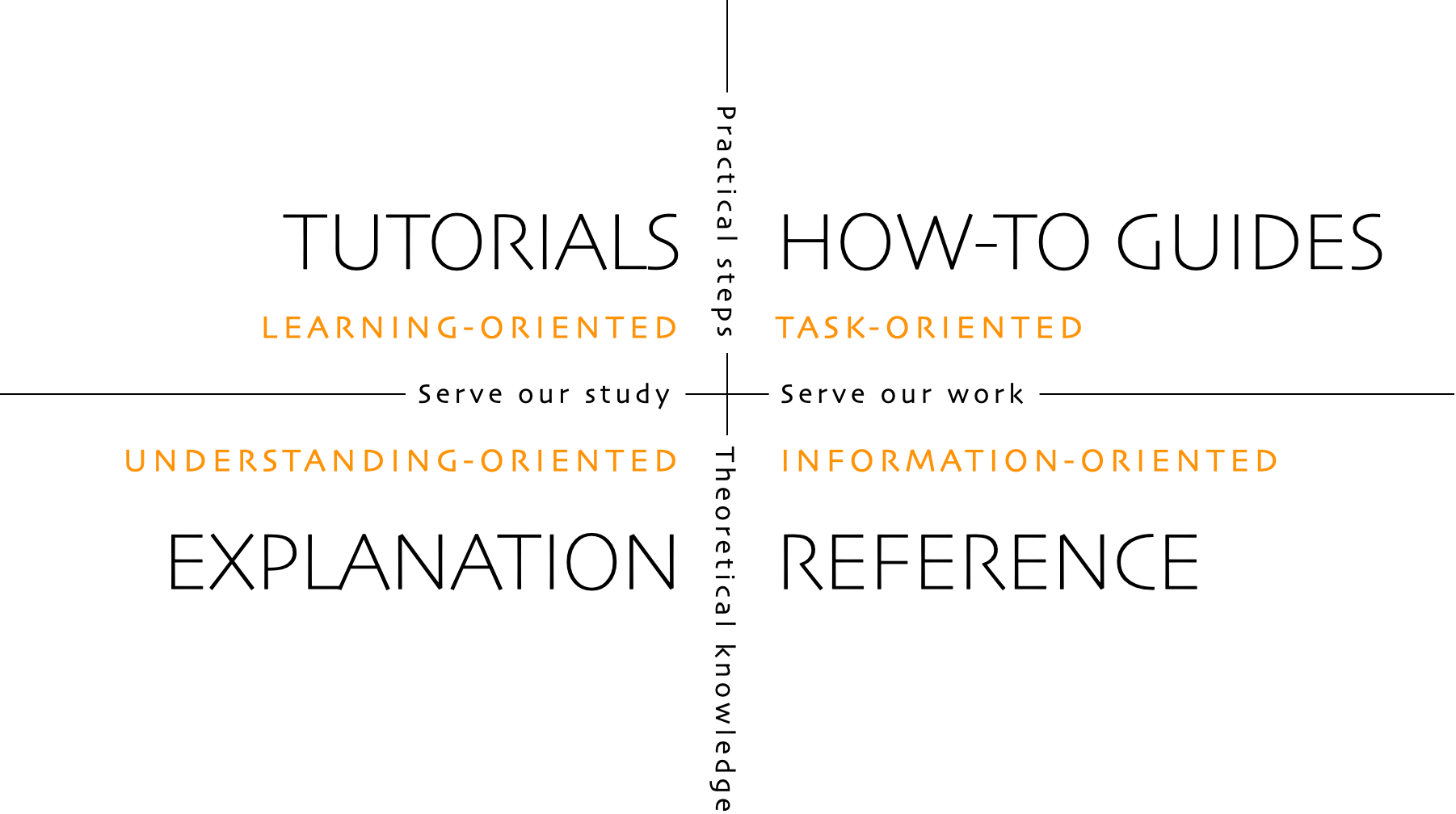 We suggest spending some time with Diataxis.fr (opens in a new tab) to become familiar beyond this summary.